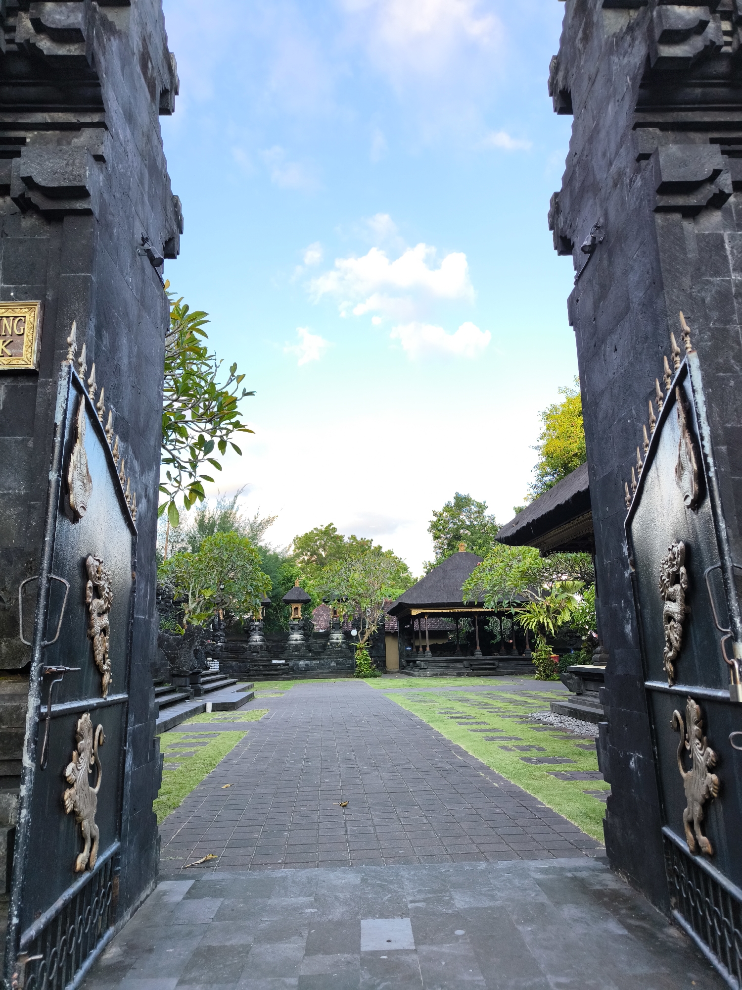 The image captures a view through an open, ornate, dark-stone gate, presumably the entrance to a temple or significant structure, in Pesinggahan, Indonesia. The gate's design features raised, bronze-colored embellishments depicting stylized creatures. Beyond the gate, a pathway of dark, interlocking stones leads into a courtyard. Patches of grass grow between the stones, adding green accents to the gray-toned pathway. Various tropical trees and plants are visible, surrounding a pavilion-like structure with a thatched roof. Further back, smaller shrine-like structures are visible, suggesting a religious or cultural site. The sky above is light blue with scattered clouds.