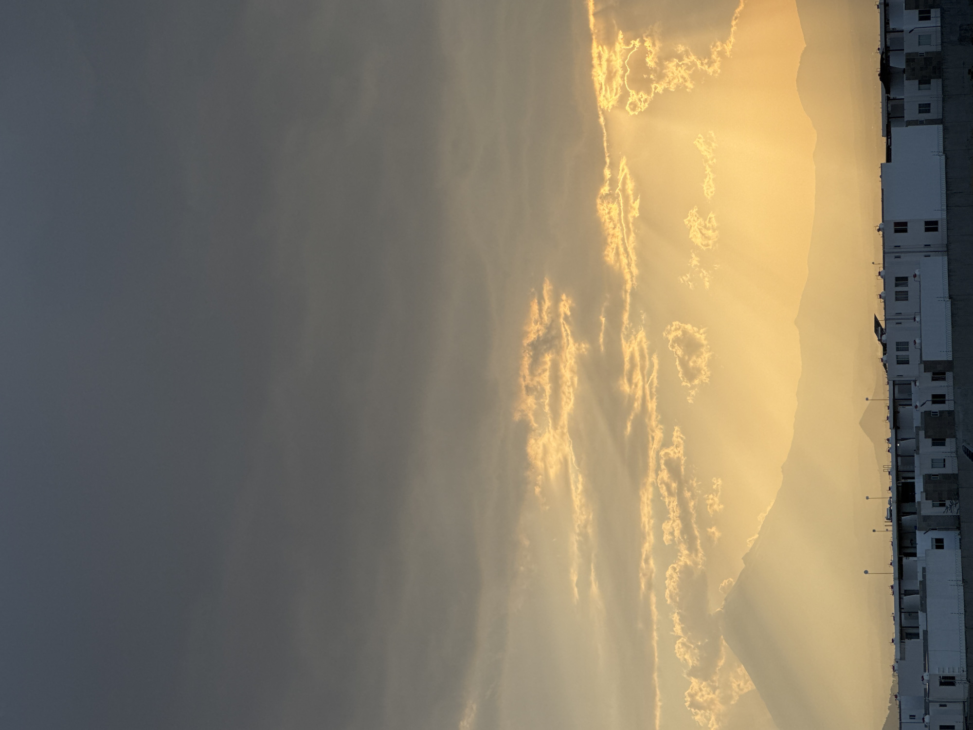 The image displays an elevated panoramic view of San Francisco Ocotlán, Mexico, during either sunrise or sunset. The sky transitions from a dark grey, overcast upper portion to a luminous golden-orange horizon, where sunlight penetrates through clouds, creating distinct crepuscular rays. A large, hazy mountain peak is silhouetted on the left background, with additional mountain ranges extending to the right. The midground features a dense cluster of white, multi-story residential buildings with flat roofs, some equipped with solar panels. Streetlights are interspersed among the structures. A low concrete wall topped with security fencing, likely barbed wire, forms the immediate foreground. No human subjects, animals, or active events are depicted.