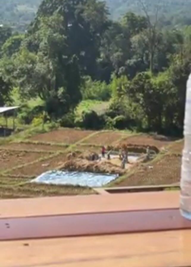 group of people working in a terraced rice field. The field is divided into several sections, some of which have been harvested, leaving behind dried stalks and stubble. There is a large blue tarp spread out in the center of the field. The people appear to be gathering and sorting the rice. The field is surrounded by lush green trees. The camera appears to be positioned on a deck or balcony, with a wooden railing visible in the foreground. A bottle of water sits on the railing. In the distance, mountains are visible under a clear sky.