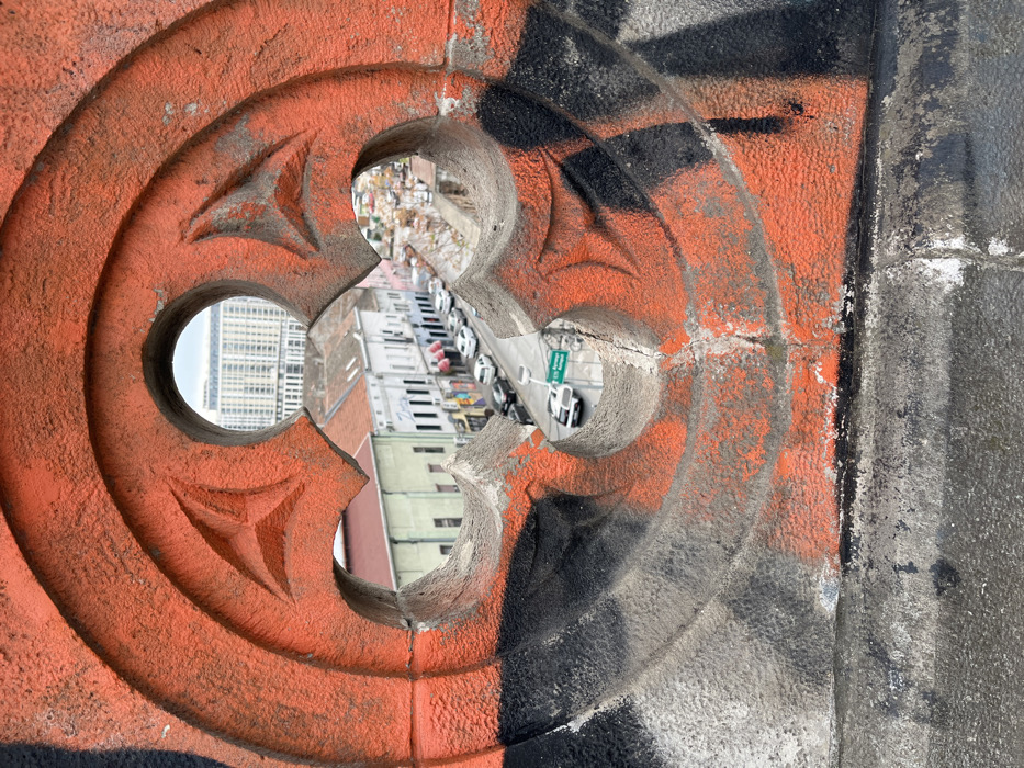 The image presents an elevated, downward-angled view through a heavily graffitied, ornate grey stone architectural element