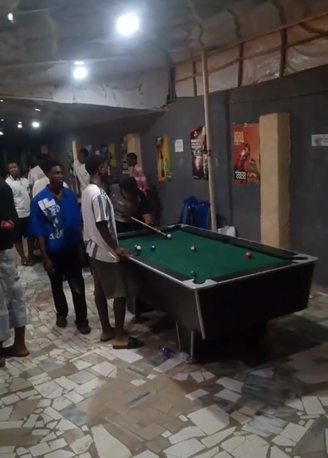 Several people are gathered around a pool table in a dimly lit room. One man is taking a shot at the pool table, while others stand around watching. The room has a low ceiling and tiled floor. There are posters on the wall and some seating behind the pool table. The people are dressed in casual clothing.