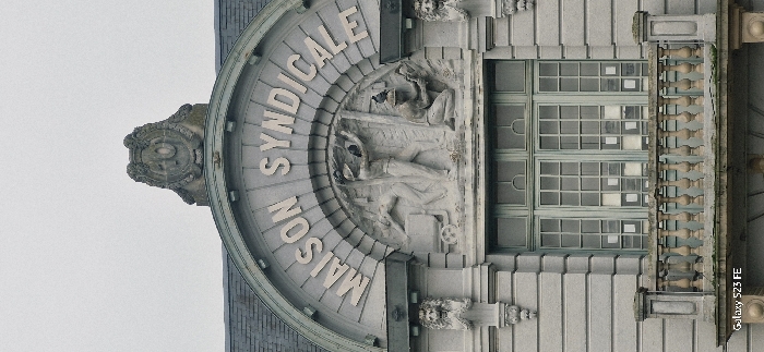 A close-up shows the upper facade of a building, dominated by a semi-circular architectural element. Embossed lettering reads "MAISON SYNDICALE" around the curve. A sculptural relief depicting figures engaged in labor fills the space within the arc. A multi-paned window sits adjacent to the inscription, flanked by decorative stonework. The architectural style suggests a historical or institutional building. A small text on the right reads "Galaxy S23 FE".