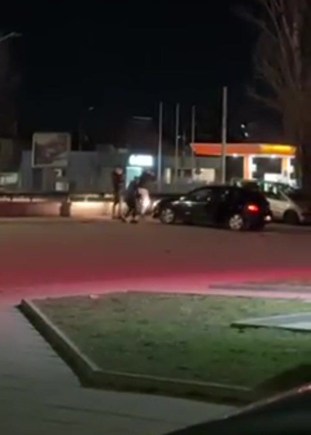 At night, two people are gathered around the front of a dark-colored car that has damage to the front passenger side. A third person stands nearby. The car is parked in a parking lot area on a dark street, with a gas station visible in the background. It appears the people are assessing the damage to the vehicle. A small grassy area is in the foreground of the shot. The video seems to be taken from inside a parked vehicle.