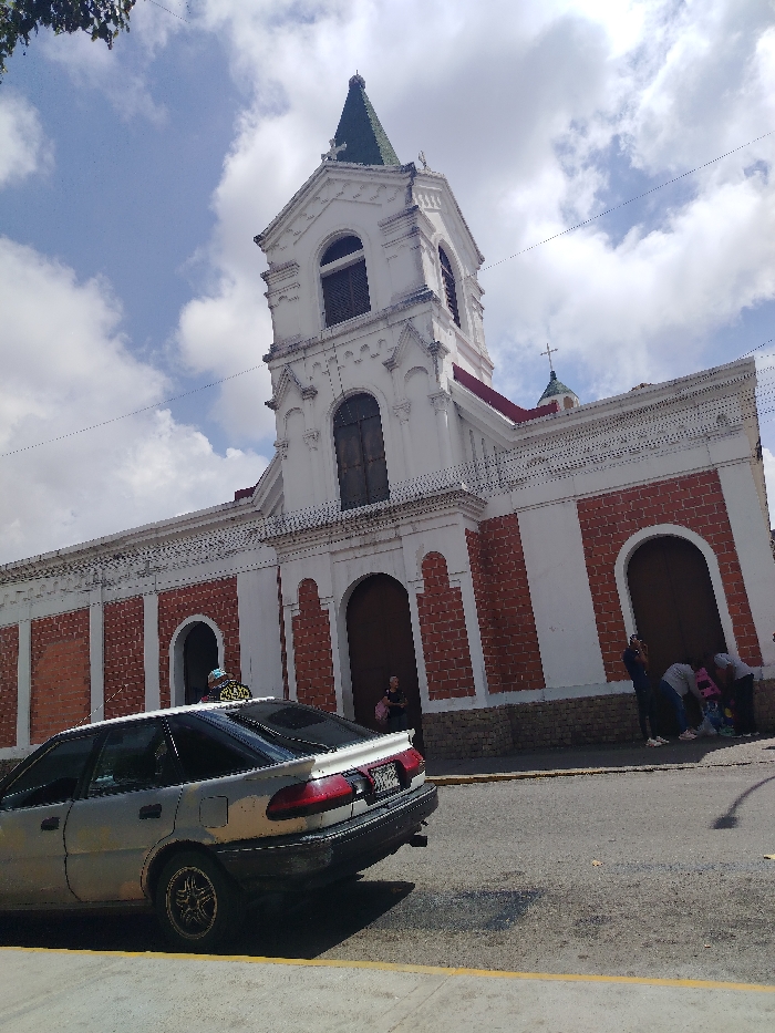The image presents a street-level view of the Catedral San Felipe Neri in Los Teques, Venezuela, under a partly cloudy sky