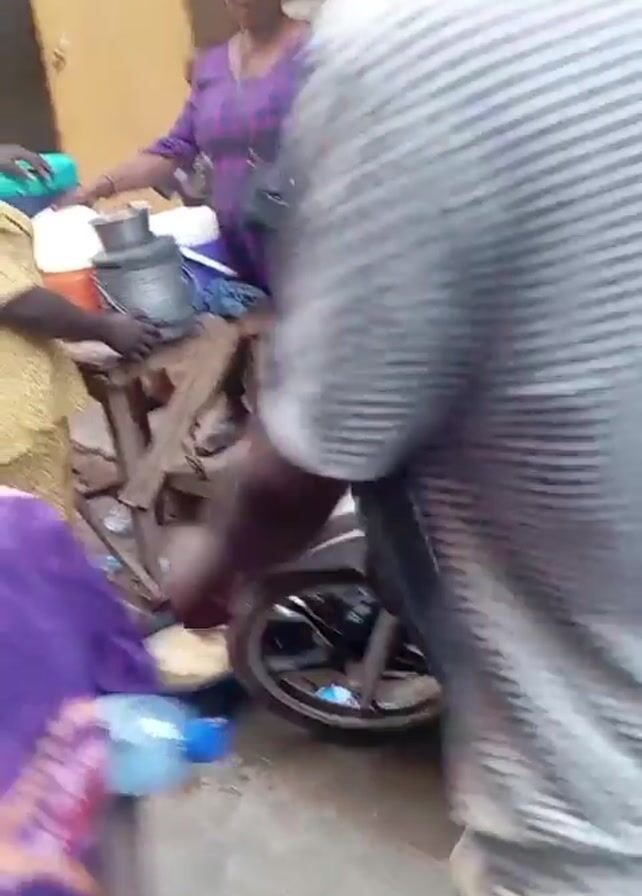 The video depicts a bustling outdoor market scene with several individuals walking around. In the foreground, two women wearing baseball caps are standing near a wooden table laden with pots and containers. One is dressed in a yellow patterned outfit, and the other is wearing a long, purple plaid dress. They appear to be handling food or supplies on the table. A parked motorbike is partially visible, obscuring the view. A man in a striped shirt and tan pants walks past the women. In the background, there are more market stalls with various goods, baskets, and produce. A second motorbike is visible parked near a stall. The ground is wet and littered with debris, indicating a busy and well-used market space.