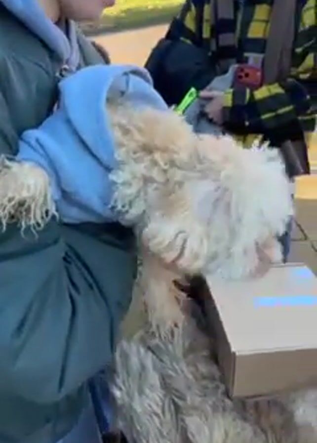 young woman outdoors holding a fluffy, light-colored dog in her arms. The dog is wearing a small blue hoodie. The woman is wearing glasses and a green jacket with a blue hoodie underneath, and her blonde hair is in a ponytail held by a scrunchie. Another person wearing a yellow and black plaid shirt stands nearby. The woman adjusts the dog’s hoodie. The background includes grass, a path, and a building in the distance. Someone says "Teddy, wow."