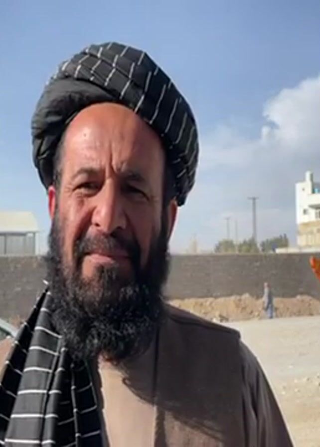 A middle-aged man with a dark beard and a black and white checkered turban and scarf stands facing the camera, speaking