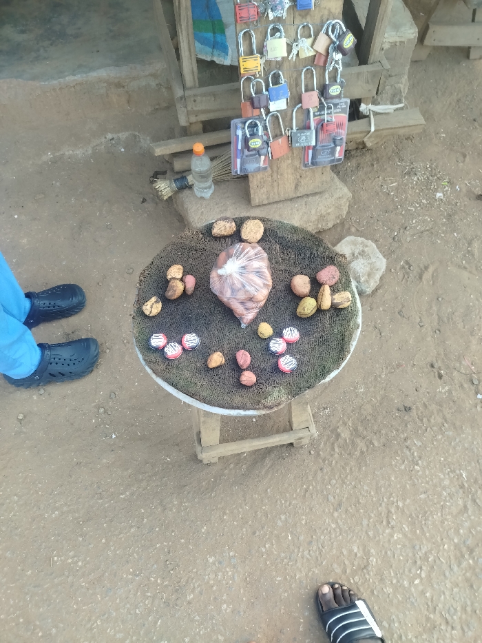 A small round wooden table displays items for sale. Scattered across the surface are various nuts, some bottle caps, and a bag filled with what appears to be more nuts. A padlock display hangs in the background. A water bottle and broom lean against the display. One person wears blue pants and black Crocs to the left of the table, while another person’s bare feet clad in sandals is visible on the ground near the bottom of the frame.