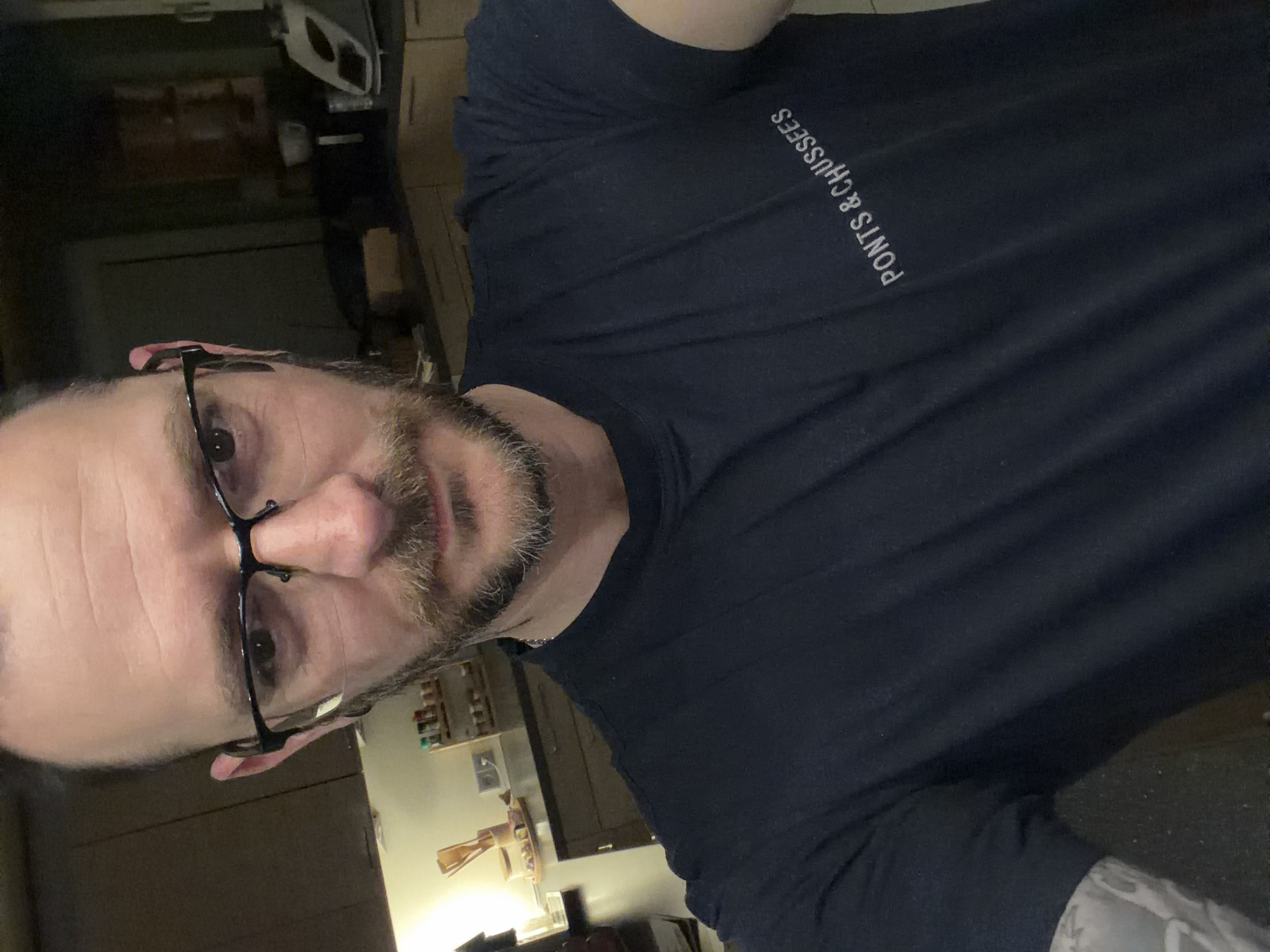 A male individual, approximately 30-50 years old, with fair skin, dark short hair, a receding hairline, and a short beard/mustache, is depicted in a selfie-style photograph. He wears black-rimmed eyeglasses and a dark blue short-sleeved t-shirt with the light-colored text "PONTS & CHUSSEES" printed diagonally across the chest. A thin, light-colored chain is visible around his neck, and a dark earbud or hearing device is present in his right ear. A tattoo with a light-colored, possibly floral or abstract design is visible on his left forearm/bicep area. He is looking directly at the camera. The background indicates an indoor setting, consistent with a kitchen or dining area. Dark brown upper cabinets are visible on the left, below which is a light-colored countertop holding a wooden utensil holder with various utensils, a small tray with items, and a white electrical outlet. A small, multi-tiered shelf unit containing jars or bottles is positioned against the wall. On the right, dark lower cabinets with light-colored drawer fronts are present, topped by a dark countertop on which a white bowl/cup and a white and gray appliance are situated. The lighting is ambient, with some localized illumination on the countertops. The specific location within Trassem, Germany, cannot be determined from the visual evidence.