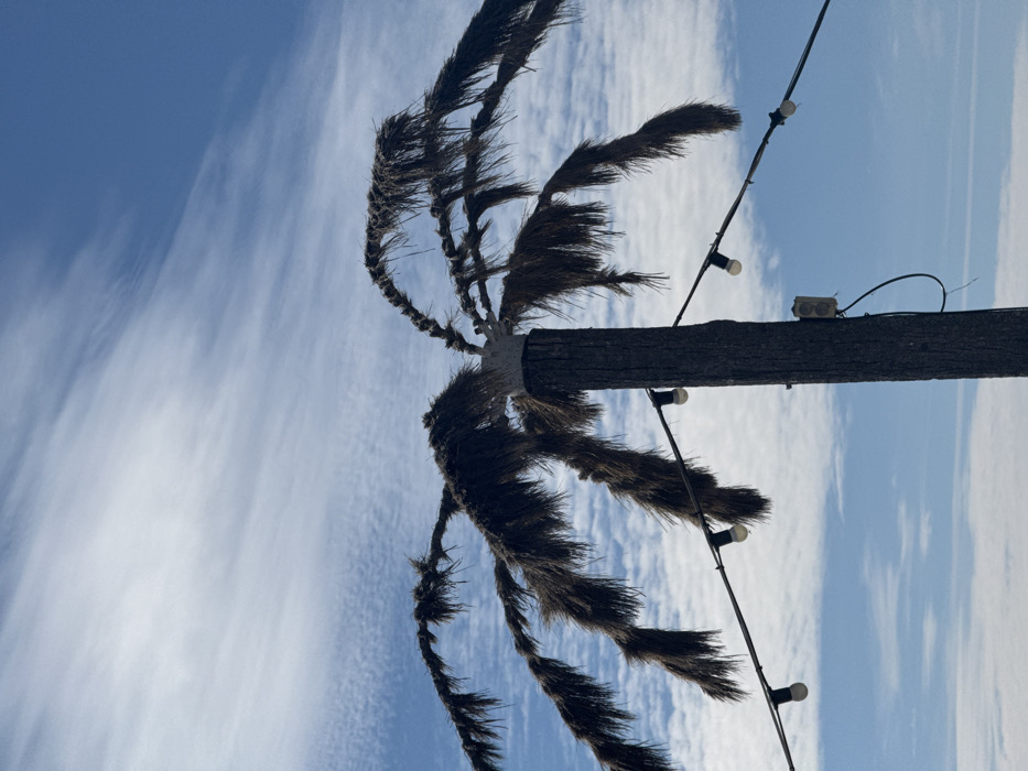 - "The image displays a weathered or artificial palm tree positioned against a clear blue sky sparsely populated with wispy white clouds" by FM-wheQH3, licensed under CC BY 4.0