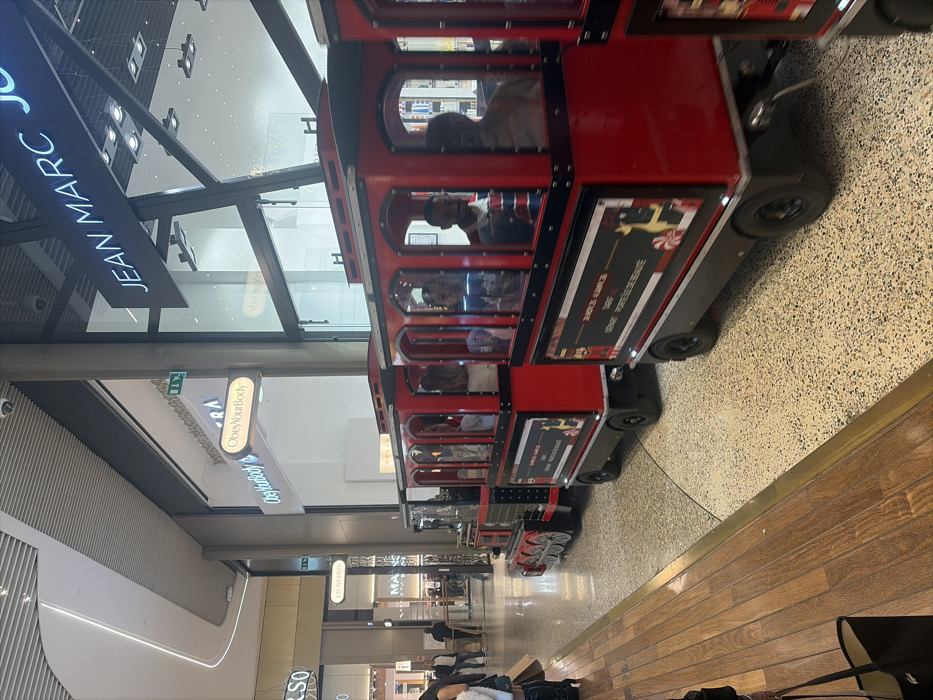 The image depicts an interior scene within a modern shopping mall, likely Cap 3000 in Saint-Laurent-du-Var, France. The primary subject is a multi-car, trackless miniature train, painted red and black, moving from left to right across the frame. The train consists of a lead locomotive and at least three passenger cars. Each passenger car features side panels with festive, Christmas-themed graphics, including candy canes and a reindeer, along with French text that reads "SANTA AMBASSADOR," "DEMON PORTEUR DE BEAUTE," and "TARIF." Multiple individuals are visible inside the train cars, with a male adult observer with a beard identifiable in the second passenger car from the front, looking towards the right. Other passengers are less distinct due to motion blur. The mall environment features polished light brown wooden plank flooring in the immediate foreground, transitioning to a speckled light-colored terrazzo-style floor where the train operates. Retail storefronts line the concourse; "ObeyYourBody" is prominently displayed on a lit sign above a white shop, and "JEAN MARC J" (likely Jean Marc Joubert) is visible on a large black sign above a glass facade on the right. Further into the background, "JM WESTON" and partially visible "MARC JACOBS" signs indicate additional retailers. The mall architecture includes high ceilings with linear and square artificial lighting fixtures, and large glass storefronts with dark structural framing. Several additional individuals are observed walking in the background, some carrying shopping bags, engaged in typical mall activities.