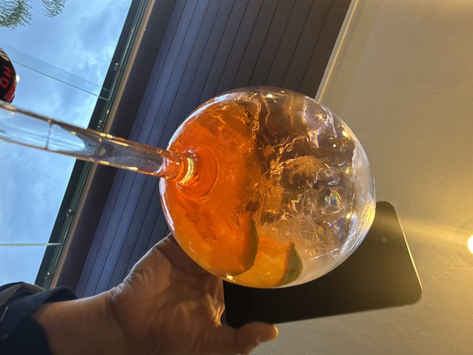 A stemmed glass filled with a vibrant orange liquid and ice rests on a black smartphone. The drink, garnished with citrus slices, is held by a hand. Outside, a window reveals a cloudy sky and the eaves of a building with dark wood paneling. The background transitions to an interior space with pale yellow walls.