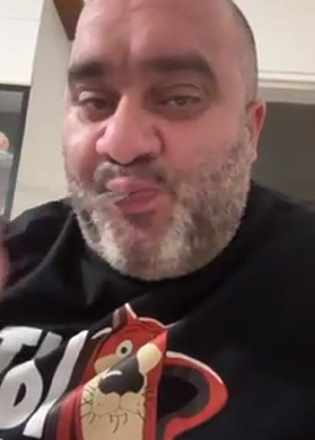 A close-up video shows a bald man with a graying beard wearing a black t-shirt with a cartoon character on it