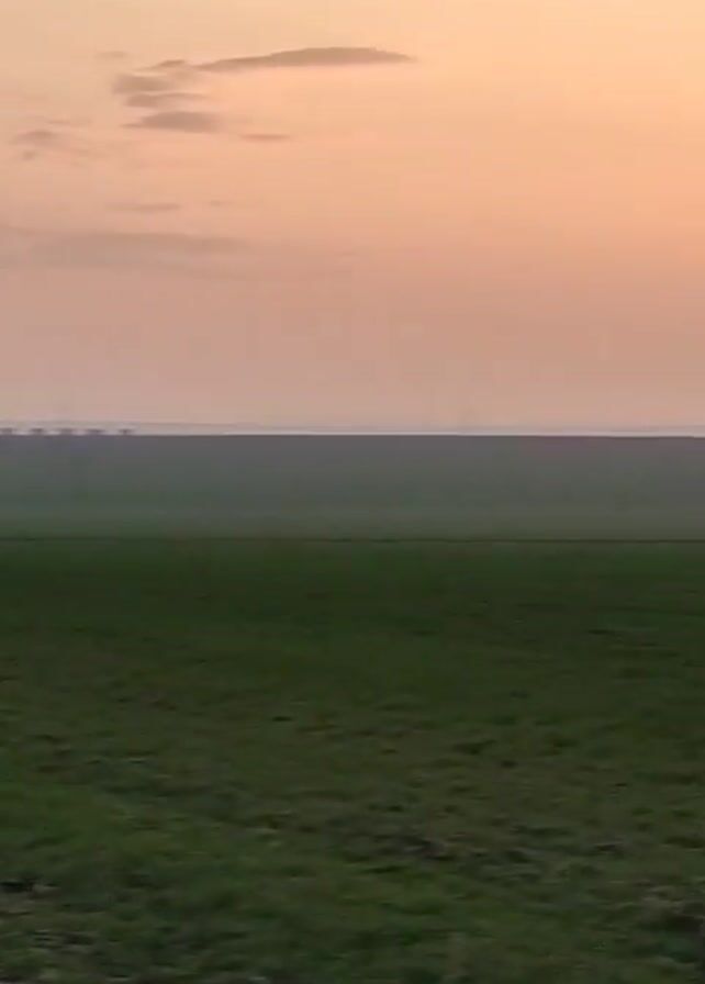 A person wearing a dark hooded jacket and dark pants rides a bicycle on a narrow dirt path through a green field. The camera pans away from the cyclist to show the field, and then to the horizon where the sun is setting in a sky that is pink, peach, and light blue.