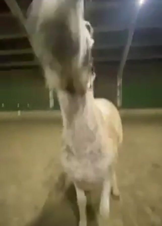 light-colored horse, possibly a gray or white horse with speckles, rearing up on its hind legs in what appears to be an indoor riding arena with a dirt floor. The horse is wearing a halter and stands upright for a few moments. The camera then moves closer, providing a detailed view of the horse's face. The arena has metal support beams and bright fluorescent lighting. The background features glimpses of green walls.