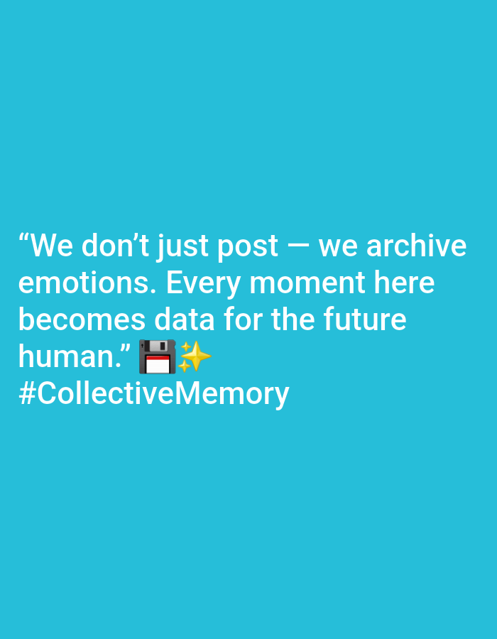 The image is a digital graphic featuring white text and emojis on a solid, light blue background. The main text, presented in a sans-serif font, reads: "“We don’t just post — we archive emotions. Every moment here becomes data for the future human.”" This statement is followed by a floppy disk emoji (💾) and two sparkling stars emojis (✨). Below this, the hashtag "#CollectiveMemory" is displayed. The scene depicted is purely textual and symbolic; there are no people, physical subjects, or objects other than the text and emojis. No physical location, including 김포시, South Korea, is discernible or depicted within the image.