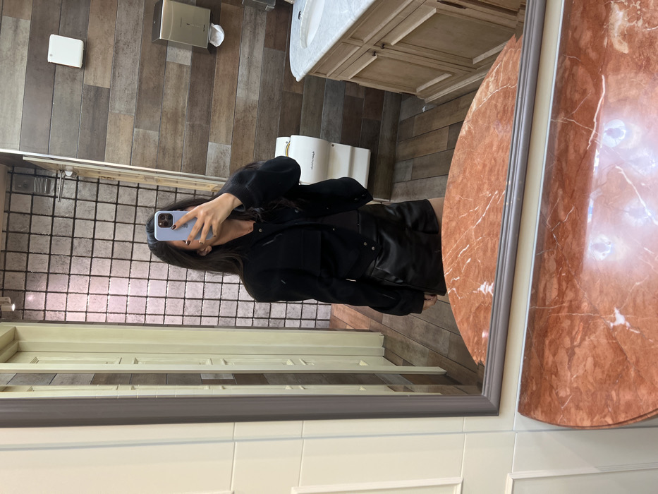 An interior image captures a female individual taking a mirror selfie within a public restroom located in Yerevan, Armenia. The subject, with long dark hair, is dressed in a black bomber-style jacket and black faux-leather shorts. Her left hand holds a light blue smartphone, obscuring her face; dark nail polish is visible on her fingers. The reflection reveals a diverse background: to the immediate left, white paneled wainscoting and a light-colored wooden door are visible. The central and right background features a dark tiled wall with a grid pattern, adjacent to a wooden plank-style wall. Objects within the reflection include a white wall-mounted toilet, a white wall-mounted hand dryer, and a metallic toilet paper dispenser. A light-colored marble countertop with a white sink basin and light brown wooden vanity cabinets are visible on the right. The floor appears to be light brown wooden planking. In the foreground, a prominent curved countertop crafted from reddish-orange marble with distinctive white veining partially obstructs the lower portion of the reflection. A dark-framed mirror, within which the entire scene is captured, is mounted above this countertop.