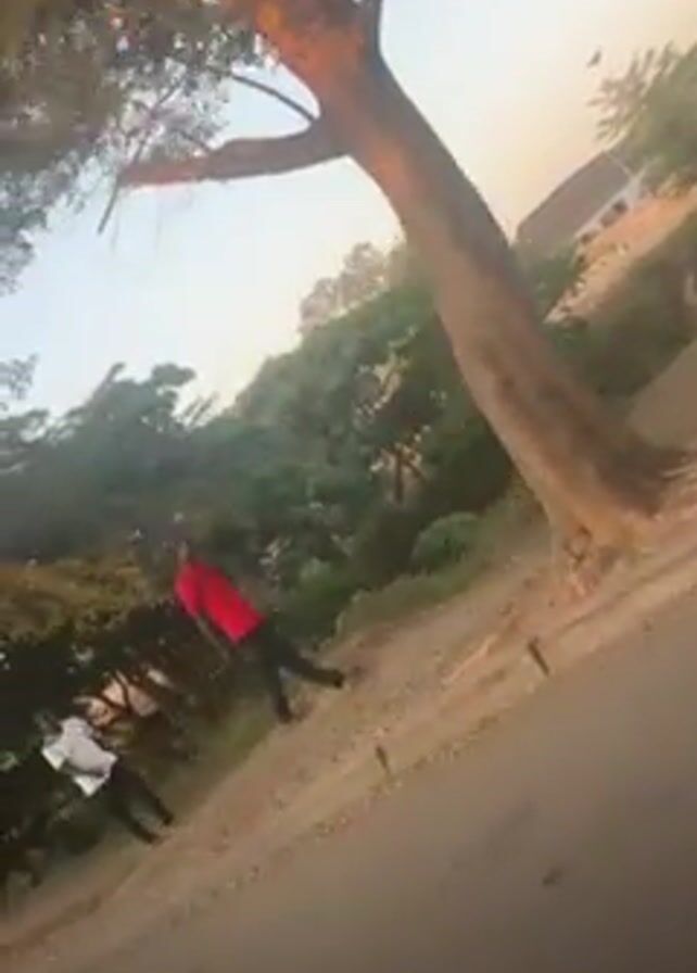 street scene during daylight. Two people are walking along the side of the road, near trees and shrubbery. One individual wears a red shirt and the other wears a white shirt. The camera appears to be moving, possibly from a vehicle. The sky is visible through the trees.