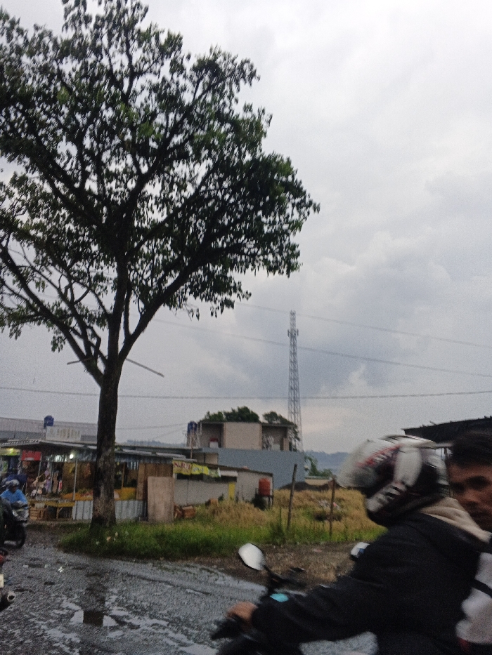 The image depicts a roadside scene in Carmen, Philippines, under an overcast sky. In the foreground, the handlebars and a rearview mirror of a dark motorcycle are visible on a wet road surface with puddles. A person wearing a dark jacket and a white, red, and black helmet is partially visible, operating the motorcycle. Their face is cropped on the far right. A large tree with dense green foliage and a dark trunk stands prominently on the left side of the frame. To the left of the tree, several open-air stalls or small market structures are present, displaying various goods. A blue motorcycle is parked near these stalls. Behind the stalls and tree, an assortment of low-rise buildings, some with metal roofs, are visible. A patch of dry, light-colored vegetation extends from the mid-ground towards the right. In the background, a tall, lattice communication or transmission tower rises against the sky. Power lines traverse the upper mid-ground. Distant hills or mountains are faintly discernible on the horizon beneath the heavy, grey cloud cover.