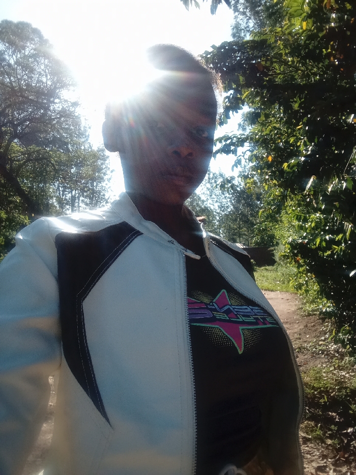 A person stands outdoors wearing a white jacket with black accents over a dark t-shirt with a colorful graphic. Strong sunlight obscures their face, creating lens flare. The background features a natural setting with trees and vegetation. A faint path can be seen leading into the distance. The image is taken from a low angle, looking slightly upward.