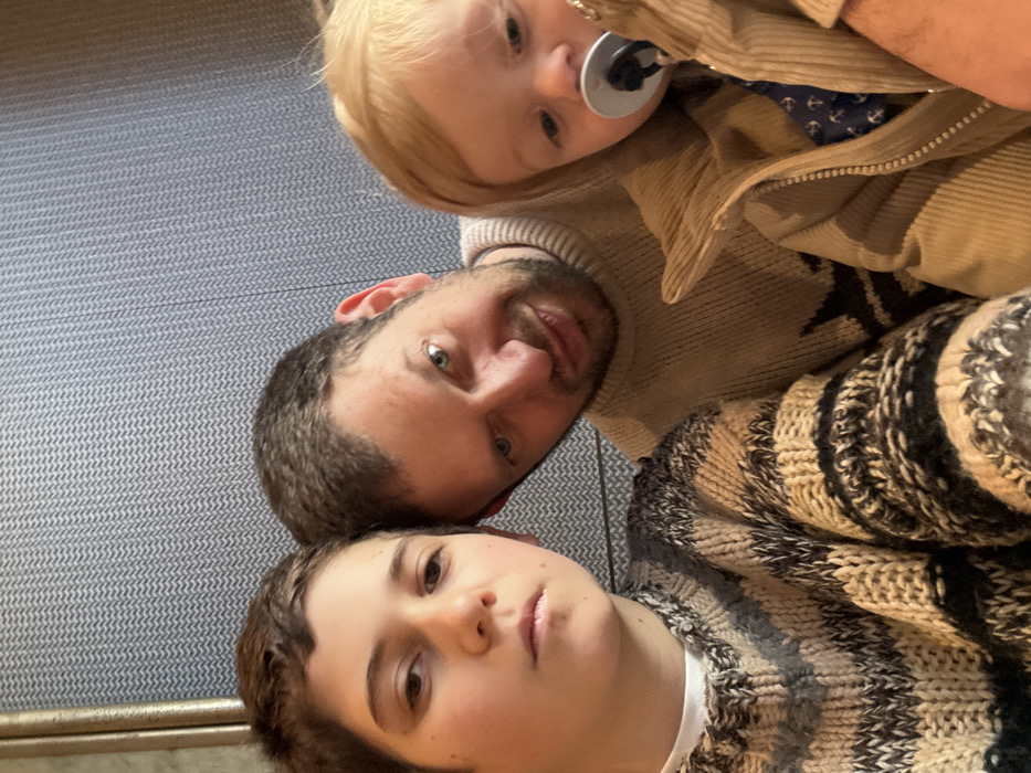 A close-up photograph depicts three individuals positioned vertically within a framed indoor setting. On the left, a male adolescent with short, dark brown hair and a neutral expression wears a chunky knit sweater patterned with stripes of beige, black, gray, and white, over a white crew-neck undershirt. Centered, an adult male with short dark hair, stubble, and blue-green eyes, leans into the frame with a slight smirk, wearing a light beige ribbed knit sweater. He is holding a blonde-haired toddler, partially visible on the right, dressed in a tan corduroy jacket over a dark blue shirt with white anchor motifs, and has a black and white pacifier inserted. The toddler's gaze is directed downwards. The background is a grey wall with a distinct, small-scale chevron-like woven pattern, bordered on the far left by a narrow, vertical metallic or wooden frame. The specific location in Milan, Italy, is not identifiable from the visual content.