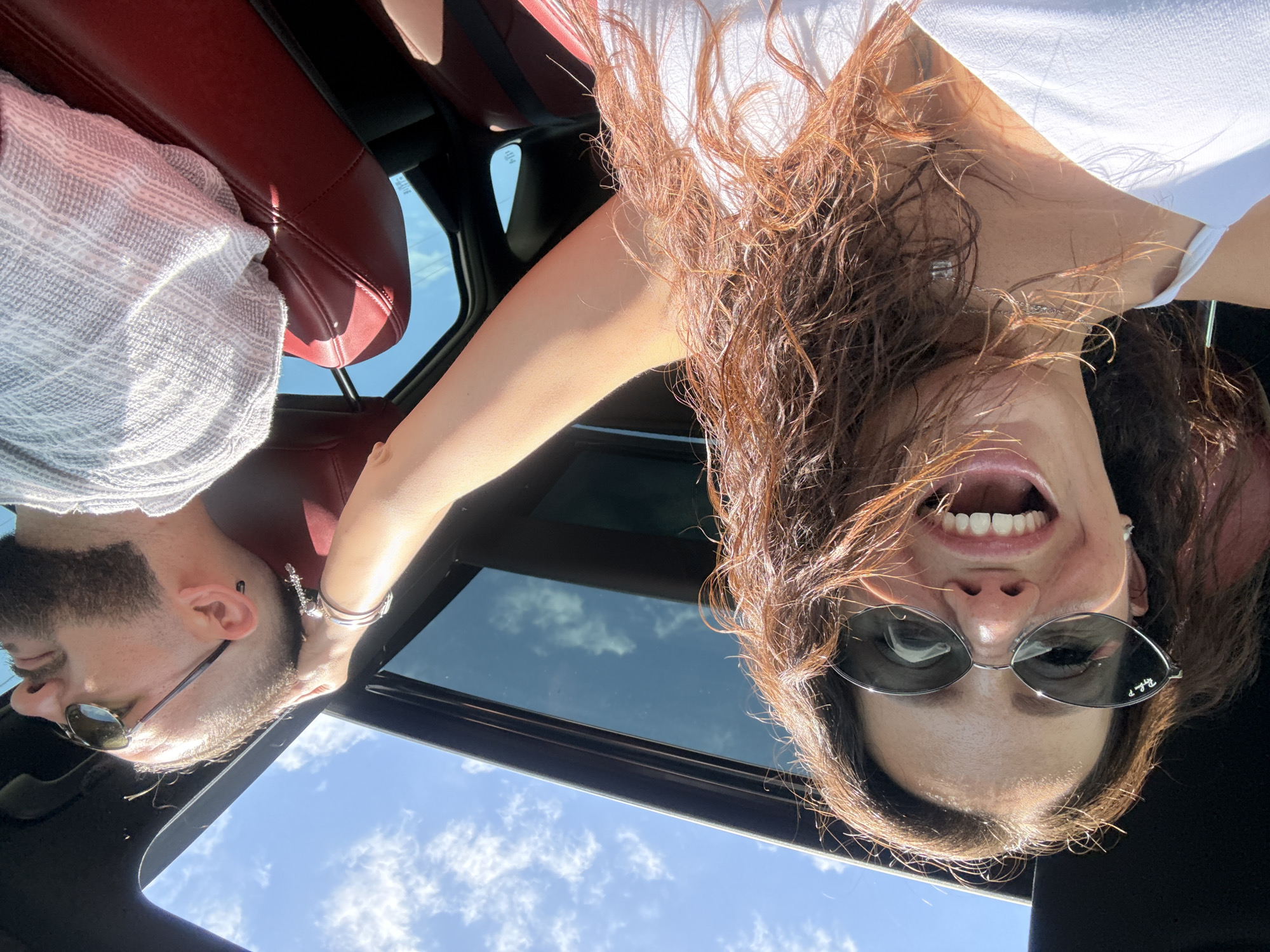 Inside a car under bright daylight, a man and a woman are visible through an open sunroof, with a view of a blue sky with scattered clouds above