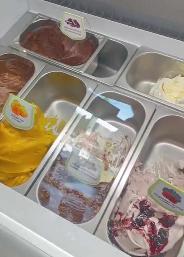 close-up of an ice cream display case, filled with various flavors of ice cream in metal containers. Each container has a label indicating the flavor, such as mango, chocolate, and berry combinations. The camera slowly pans across the display, showcasing the variety of options. The environment appears to be a shop or cafe setting.