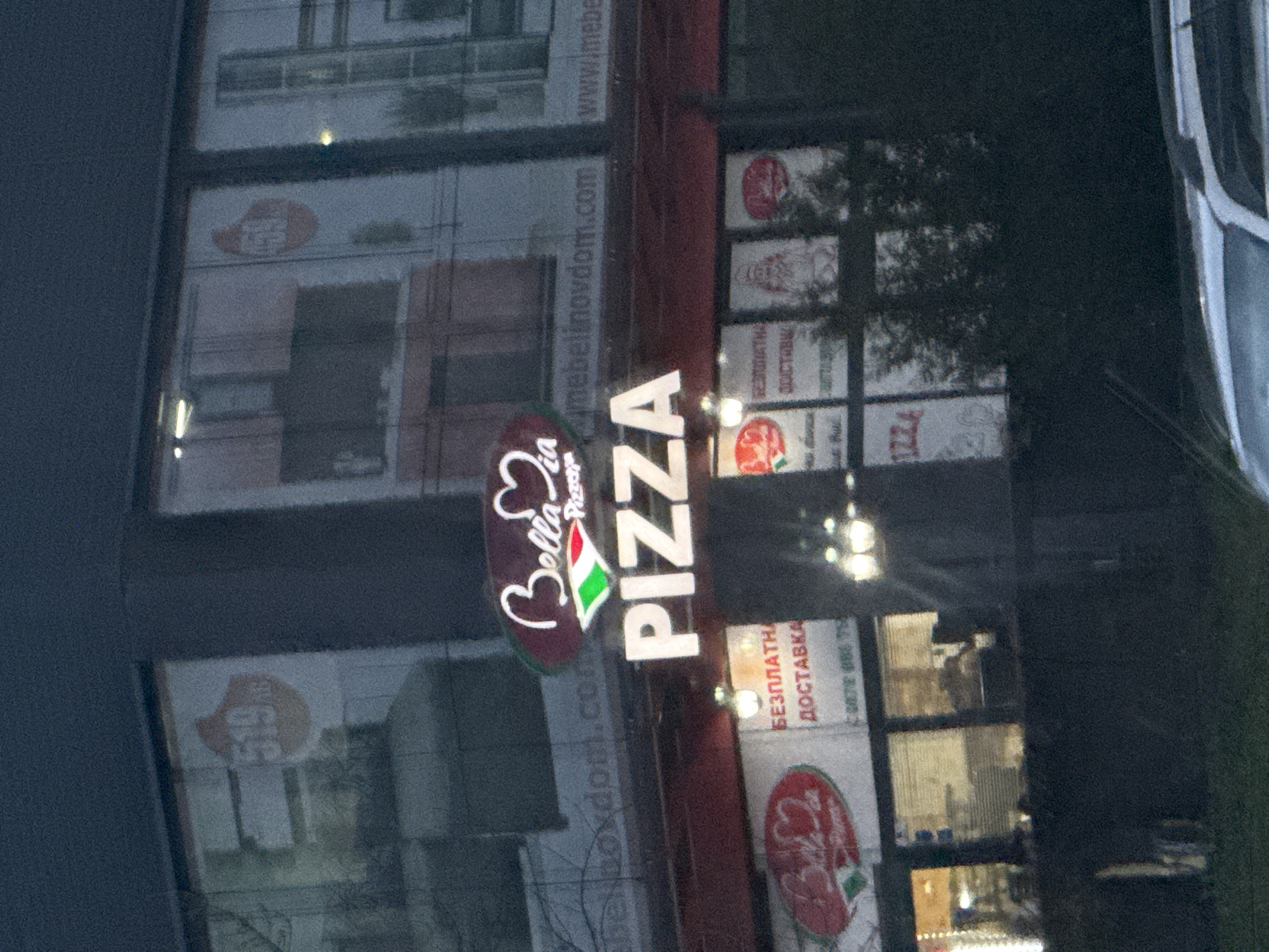 storefront of a "Bella Italia" pizza restaurant. A sign reads "Pizza" with a tricolor Italian flag motif on the "Bella Italia" logo. Signs indicate "безплатна доставка," meaning "free delivery". The building's windows are reflecting the exterior environment. The location is likely Burgas, Bulgaria, given the Cyrillic script used in the signs.