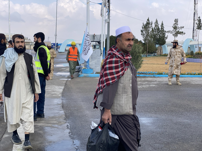 The image depicts an outdoor scene at an unspecified location in Afghanistan, characterized by a paved thoroughfare, a grassy median, and background structures. The flag of the Islamic Emirate of Afghanistan, a white banner with black Arabic script, is prominently displayed on a pole in the mid-ground. The paved ground shows patches of wetness under an overcast sky. In the immediate foreground, two men are visible. On the left, a man with a dark beard wears a light-colored shalwar kameez, a dark vest, and has a light-colored shawl draped over his left shoulder as he walks towards the left of the frame. On the right, partially visible, another man with a short beard wears a white skullcap, a grey shalwar kameez, a grey patterned vest, and a red and white checkered scarf. He carries a black plastic bag in his right hand and faces slightly left while moving towards the right. In the mid-ground, several other individuals are present. One man with a dark beard wears a black top and a bright yellow-green high-visibility vest. Behind him and to the left, another individual is partially visible in camouflage fatigues. Further to the right, a man wearing an orange high-visibility vest and a yellow hard hat walks away from the viewer. On the grassy median to the far right, a man in full camouflage fatigues, including a hat, stands holding a red object in his right hand. The background includes low-rise buildings, utility poles, and a distinctive blue archway, suggesting a facility entrance or public area.