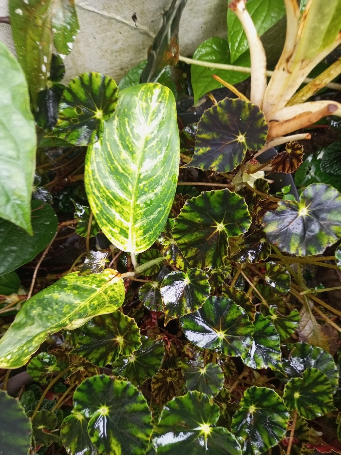 The scene is located in the city of Pandaria, India. The image depicts a dense arrangement of plant foliage. A prominent, elongated leaf with distinct light green and yellow-green variegation is centrally positioned. Surrounding it are numerous smaller, rounded to ovate leaves characterized by dark green centers and radiating lighter green to yellow-green patterns extending towards their scalloped margins. The surfaces of several leaves appear glossy, suggesting the presence of moisture. Additional solid green foliage and a thick, pale plant stem are visible along the upper right and left edges of the frame. The underlying environment consists of a dark, moist substrate. No individuals, animals, or specific actions are present.