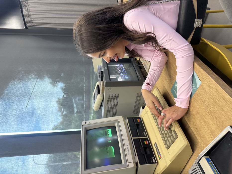 An indoor scene within HODOR HOBBY MUSEUM, located at Bulevar kralja Aleksandra 91 in Belgrade, Serbia. A young adult female, with long dark hair and wearing a light pink long-sleeved top, is seated at a light wood-grain table, visible in profile from the chest up. She is actively typing on the beige keyboard of an Apple IIe computer system. Her left hand rests on the keyboard, displaying a ring on her ring finger, while her right hand is also positioned for typing. She smiles broadly with her tongue slightly extended, looking towards the right side of the frame. The Apple IIe computer system occupies the left side of the table, consisting of the keyboard/main unit, two stacked Apple Disk II floppy drives, and a beige Thomson G CRT monitor displaying a green-on-black retro video game interface with block graphics and numerical scores. To the right, another vintage setup includes a large grey computer unit, on top of which rests a beige portable cassette player/recorder and two cassette tapes. Adjacent to this unit is a dark grey HP CRT monitor displaying blue and white pixelated graphics, possibly a different game or system menu. A small green pamphlet or card is visible on the table near her right hand. A black and beige shoulder bag with a silver clasp and chain strap hangs from her right side, partially obscured. The table is supported by what appears to be part of a yellow chair. In the background, a large window is partially covered by light blue patterned blinds. Through the blinds, an exterior view reveals green trees, a road, and distant structures, indicating an urban setting. Reversed text, including "HODOR" and "91", is visible through the blinds, confirming the museum's name and street number. A dark grey curtain is partially visible on the far right.