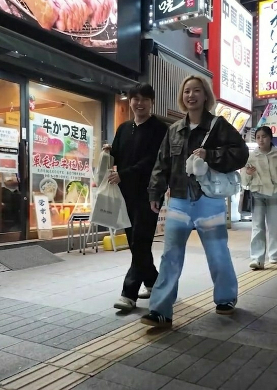 Three individuals are depicted walking from right to left along a paved sidewalk in a commercial district of Gifu, Japan, during low-light conditions. In the foreground, a young East Asian male, wearing a black long-sleeved Henley shirt and black trousers, walks while carrying two shopping bags—one transparent plastic, one white paper bearing "on the box" text—in his left hand. He exhibits a smile directed towards the viewer. Alongside him, a young East Asian female with short blonde hair wears a dark utility-style jacket, wide-leg light blue jeans with horizontal faded sections, and dark sneakers. She carries a light blue shoulder bag with a white fluffy accessory attached to its strap and is also smiling towards the viewer. Further back and to the right, a third young East Asian female, with dark hair and wearing a light-colored collared jacket and trousers, walks with a neutral expression. To the left, a building facade features a large glass storefront window displaying Japanese promotional signs, prominently featuring "牛かつ定食" (Gyukatsu Teishoku – Beef Cutlet Set Meal) alongside images of food. Above this storefront, multiple illuminated Japanese signs are visible, including "暁一号店" (Akatsuki Store Number One) and a vertical sign for "中国料理" (Chinese Cuisine). The sidewalk consists of grey and light grey rectangular pavers and includes a yellow tactile paving strip for the visually impaired. The scene is illuminated by artificial light from the surrounding urban environment and establishments.