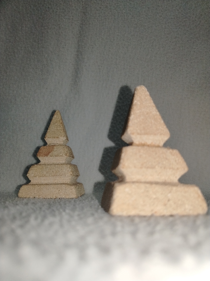 Two tan, multi-tiered, pyramidal objects sit on a mottled surface