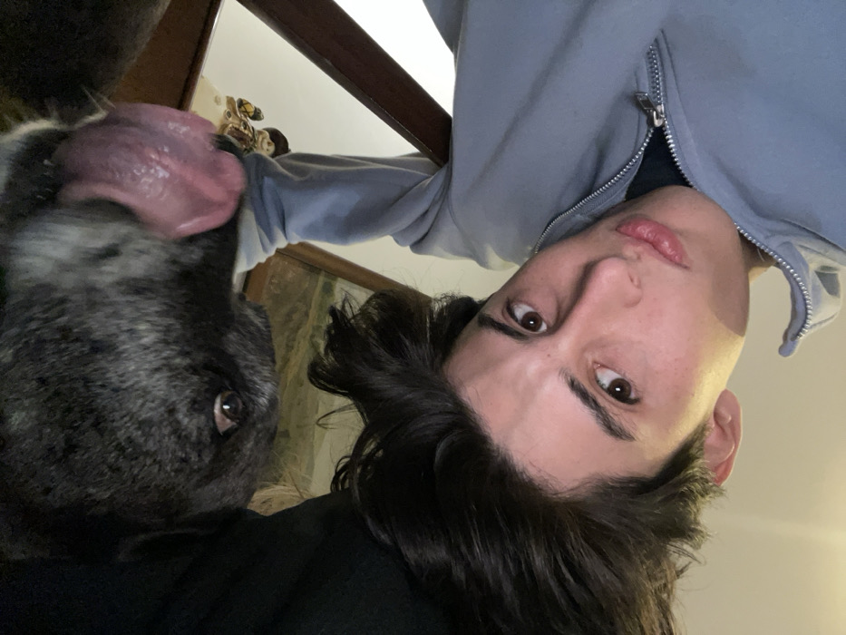 A selfie captures a young man and his dog. The man has dark hair and light skin, wearing a light-colored zip-up hoodie. His face is in focus, with brown eyes looking directly at the camera. Beside him, a gray and white dog with a large tongue is licking the camera, dominating the left side of the frame. The photo is slightly tilted, with a glimpse of a wooden banister and a framed picture visible in the background. The overall tone is casual and affectionate.