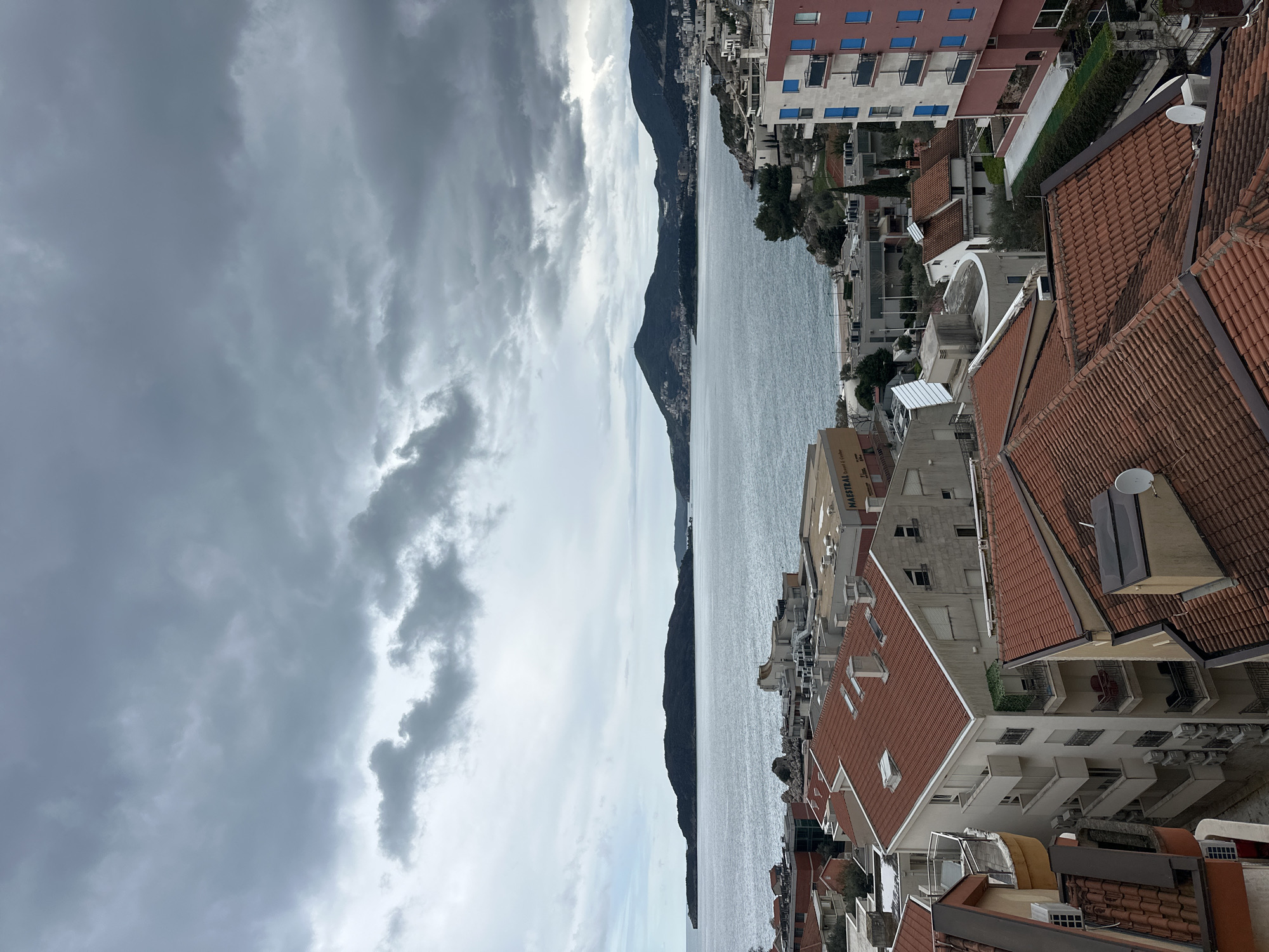 - "An elevated panoramic view overlooks the coastal town of Pržno, Montenegro, under an overcast sky dominated by dense, dark gray clouds" by FM-KFMcf2, licensed under CC BY 4.0