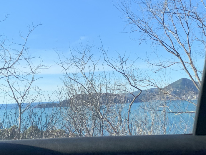 The scene depicts a daytime coastal landscape in Podličak, Montenegro, observed from within a vehicle. A clear, bright blue sky extends over a vast expanse of turquoise-blue sea. The midground features a curved coastline with a distant landmass or island forming a bay. On the right, a prominent, verdant, conical mountain rises from the coastline, displaying visible structures consistent with a settlement along its lower slopes. Numerous bare, skeletal branches of deciduous trees dominate the foreground, partially obscuring the distant view. The bottom approximately 10-15% of the frame shows a dark, out-of-focus horizontal element, consistent with a vehicle's dashboard or interior paneling, with a dark vertical structure on the extreme right edge. No human figures or specific discernible activities are present.