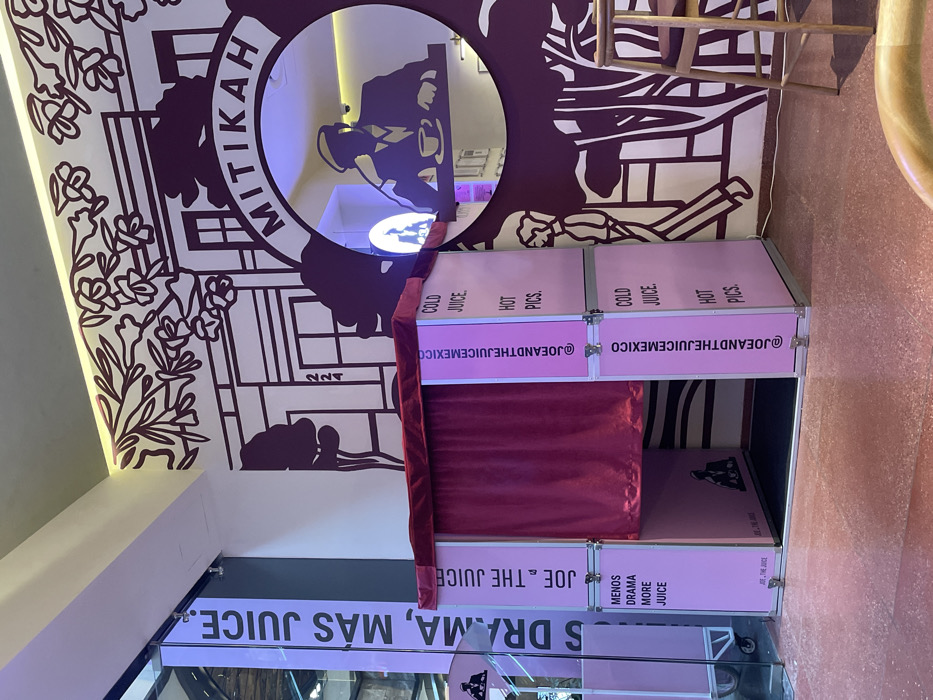 A pink and silver booth with a maroon curtain stands beneath a wall mural. The mural includes the word "MITIKAH" in bold, along with depictions of buildings, floral elements, and a figure holding a beverage. The booth features the text "@JOEANDTHEJUICEMEXICO" and phrases like "COLD JUICE" and "HOT PICS." The booth's lower section displays "JOE & THE JUICE" and "MENOS DRAMA, MORE JUICE." A partial view of a reflective surface and a wooden chair are visible at the top.