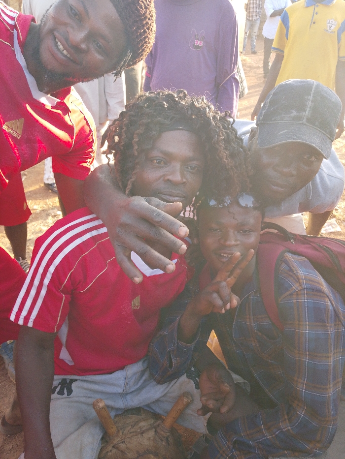 Four dark-skinned men pose closely together. One man with curly hair embraces another wearing a red and white Adidas shirt. A third man in a baseball cap leans in from the side. At the front, a young man in a plaid shirt flashes a peace sign. They are likely outdoors, based on the lighting and background showing other people. A small drum is visible at the bottom center.