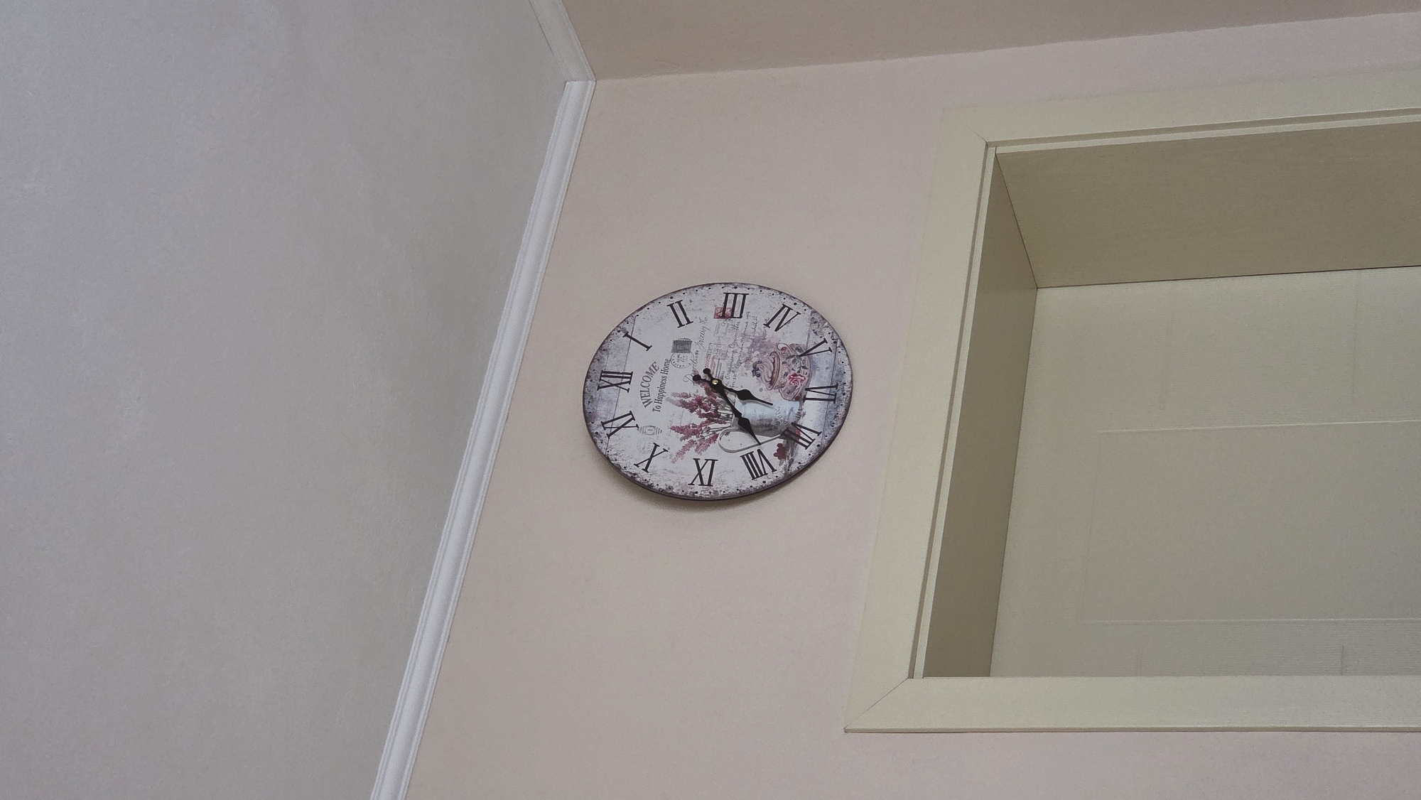 section of an interior wall, likely in a residence. The wall is painted a light beige color. On the wall is a round clock with Roman numerals and floral designs. The clock hands indicate a time around 10:30. Adjacent to the clock is a white-framed opening, possibly a door or window frame. The wall extends to the upper left, where it meets a white trim or molding. The image provides no specific information to confirm that the scene is located in Enina, Bulgaria. There are no people visible in the image, and the overall environment is quiet and domestic.