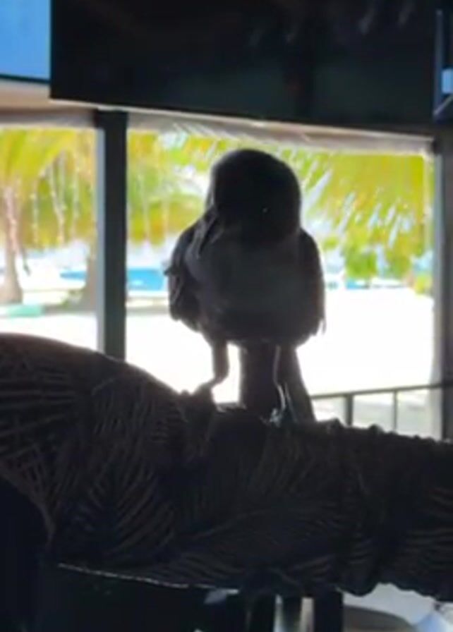 A crow sits on someone's arm inside an outdoor cafe or restaurant. The person's arm is draped over a chair, and they are wearing a long-sleeved shirt with a palm leaf pattern. The crow is black with a shiny beak and appears to be looking at the camera. In the background, there's a view of a tropical beach with white sand, turquoise water, and palm trees. There are tables and chairs within the cafe, suggesting that this is a place for dining. The overall lighting is a bit dim indoors, contrasting with the bright outdoor scenery.