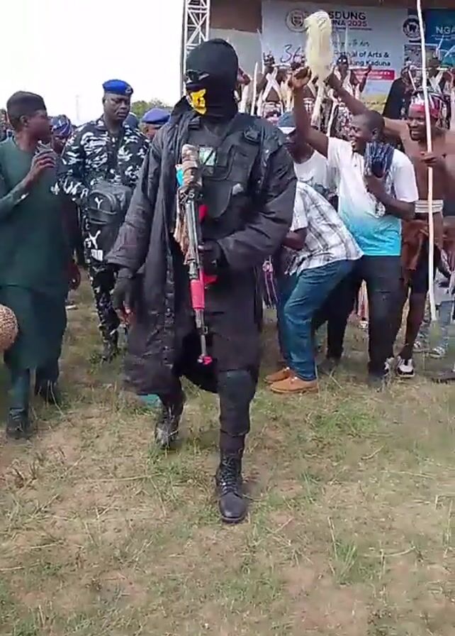 man dressed in all black, including a mask with a yellow skull design, walking with a rifle in his left hand, amidst a crowd of people. He is wearing a long, black quilted coat and black boots. Several people are filming him. In the background, there is a stage with the words "PUSDUNG KADUNA 2023" visible. There are also uniformed officers in the crowd, some of whom are holding rifles. There is grass on the ground. Many people are milling about.