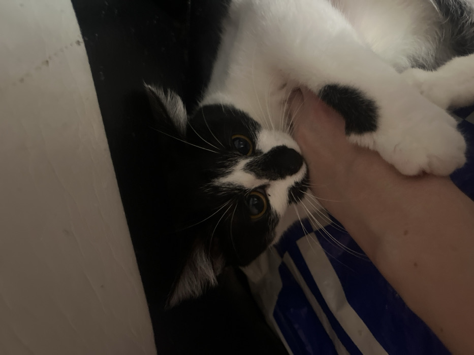 - "A black and white tuxedo cat is depicted biting or holding a human's pale forearm with its mouth, claws partially visible but not engaged" by FM-KILrf2, licensed under CC BY 4.0