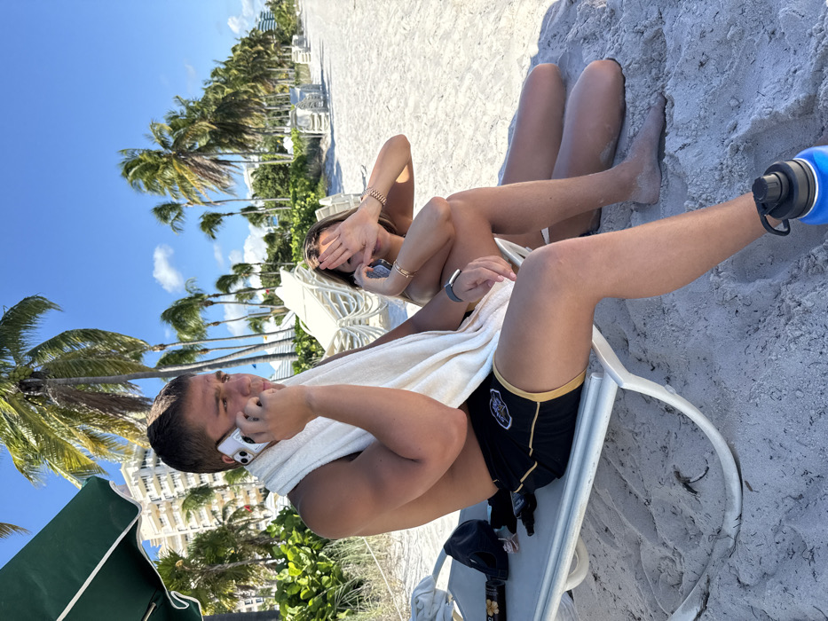 The image depicts two individuals on a sandy resort beach in Key Biscayne, United States, under a clear blue sky. A male, shirtless, wearing black athletic shorts with gold trim and a dark emblem, is seated on a white beach lounge chair. He holds a light-colored smartphone to his right ear, engaged in a call. A white towel is draped over his shoulders, and a dark smartwatch is on his left wrist. To his left on the lounge chair, a black baseball cap, sunglasses, and a small dark container are visible. At the bottom right, a blue water bottle with a black lid rests in the sand near his foot. Adjacent to the male, a female is seated directly on the sand, partially obscured. She holds a dark smartphone in her left hand, and her right hand covers her face. She wears multiple gold-colored bracelets and a matching watch on her left wrist. The background features numerous tall palm trees lining the beach. Behind the palm trees to the left, a large, multi-story white building with balconies, indicative of a resort or condominium, is visible. Further down the beach, multiple stacks of white lounge chairs are present. A green beach umbrella is partially visible in the upper left corner. The scene is brightly lit by direct sunlight.