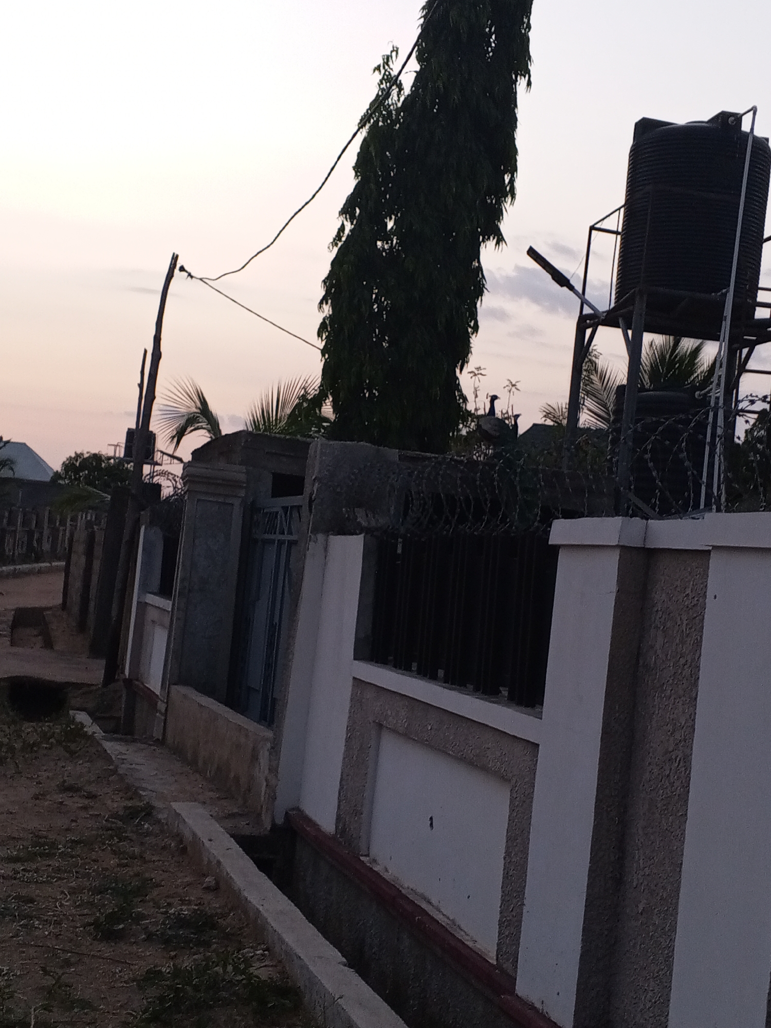 The image depicts a street scene in Adonkolo, Nigeria, at dusk or dawn. In the foreground is a partially constructed or unfinished concrete fence running along the edge of the street. The fence features alternating sections of solid concrete and open metal bars topped with barbed wire. Behind the fence, foliage including palm trees and taller trees can be seen. In the background, a black water tank on a metal frame stands prominently. Utility poles and wires run across the sky. The ground is a mix of dirt and sparse vegetation. The sky is pale with hints of pink and gray.