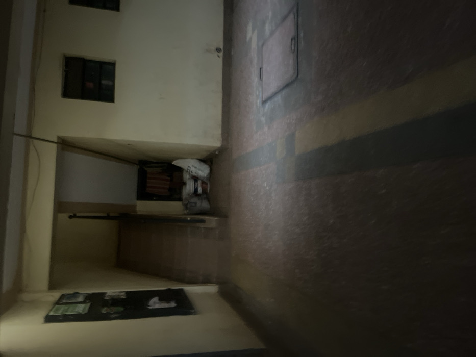 An indoor corner with cream-colored walls and dark flooring. A window and a second, smaller window are on the left wall. A black mat lies on the floor near the base. In the back corner, a shelf holds miscellaneous items. The right wall is predominantly dark, featuring a square access panel. A dark stripe runs horizontally across the wall.