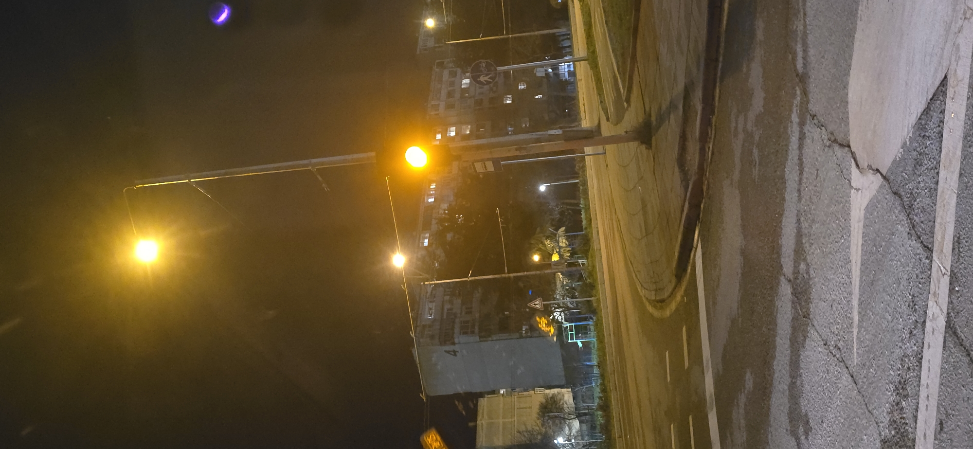 The image displays an urban street scene captured at night, depicting the intersection of Tsar Osvoboditel Boulevard and Shipka Street in Varna, Bulgaria. The dark sky is partially illuminated by artificial light sources, creating a pervasive yellow-orange glow. In the foreground, an asphalt road surface exhibits multiple cracks and localized wet patches. White painted road markings, including solid lines and dashed lines, are visible. A concrete curb separates the roadway from a narrow paved area or sidewalk. A prominent metal pole stands on the right side of the frame, supporting a traffic light that emits a solid yellow/orange signal. Below the traffic light, attached to the same pole, are a blue rectangular sign indicating a bus stop and a circular blue sign featuring white pictograms of a pedestrian and a bicycle, signifying a shared path. Further into the scene, a triangular warning sign with a pedestrian crossing symbol is discernable. Another street light, also emitting yellow illumination, is visible in the upper left quadrant. In the background, beyond the road and a strip of ground with several bare deciduous trees, multiple multi-story apartment buildings are visible. One apartment block on the left side of the frame clearly displays the large numeral "4" on its exterior. Numerous windows within these background buildings are illuminated. No individuals or vehicles are present or actively engaged in the scene. A purple, crescent-shaped lens flare is visible in the upper right corner of the image.