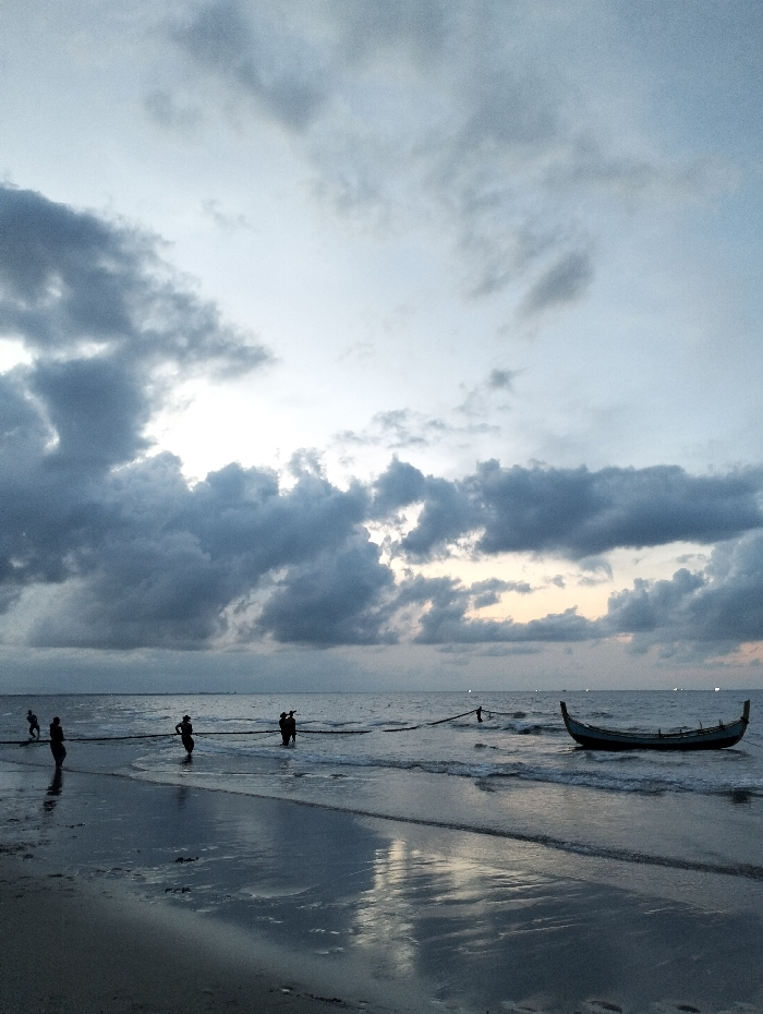 The image depicts a coastal scene in Curehtunong, Indonesia, at what appears to be twilight or dawn under an overcast sky. The sky is dominated by dark grey and lighter grey stratocumulus clouds, with some brighter patches visible, especially towards the upper center. The sea is relatively calm, with small waves breaking on a sandy shore that reflects the sky and figures. Approximately six individuals are present in the water, visible in silhouette against the lighter horizon and water. They are distributed from the left midground to the right midground, standing knee-to-waist deep in the water. These individuals are actively engaged in pulling a long, dark net or rope that extends horizontally across the frame, suggesting a communal fishing activity. On the right side of the frame, a single, dark traditional wooden fishing boat with a distinctive raised bow and stern (likely a perahu) is floating in the shallow water, positioned approximately equidistant from the shoreline and the horizon. The boat appears unoccupied. The overall lighting is dim, emphasizing silhouettes and reflections on the wet sand.