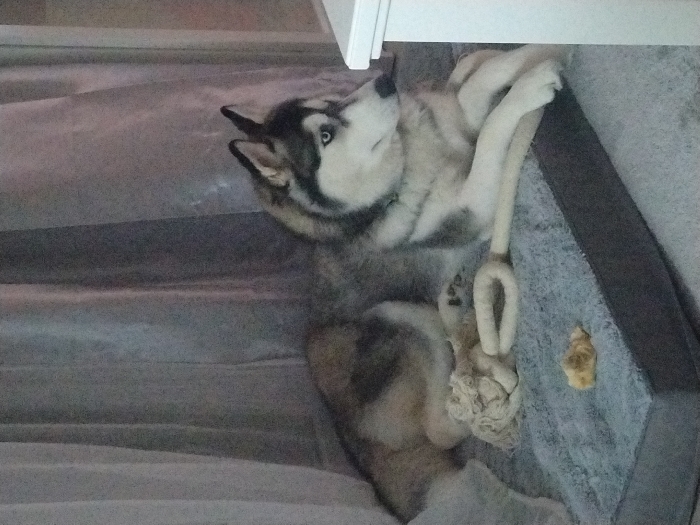 - "A husky dog lies in a gray pet bed with a cream-colored chew toy" by FM-M4lpO2, licensed under CC BY 4.0
