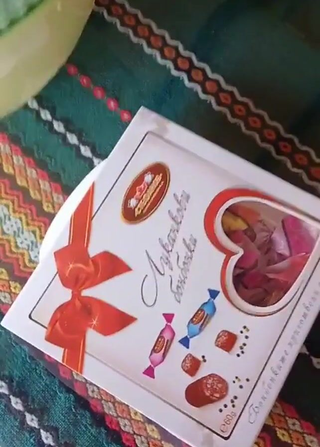 table set for a meal, covered with a patterned tablecloth. On the table, there is a box of Bulgarian Lukankovi chocolates, a green bowl filled with a salad, a bottle of Coca-Cola, glasses, napkins, forks, and other items. The person in the video picks up one of the chocolates from the box. The video pans across the table showing the setup.