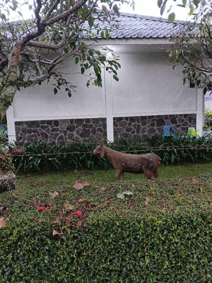 This image depicts an outdoor scene in Stueng Saen, Cambodia, featuring a manicured garden area in front of a building. In the foreground, a dense green hedge spans the width of the frame, topped with scattered brown leaves and several red petals or berries. Immediately behind the hedge, a strip of green grass is visible, across which a single strand of barbed wire is stretched horizontally, supported by an obscured post on the far left. To the right of the center, a brown, weathered statue of a four-legged animal, resembling a goat or sheep, stands facing left on the grass, positioned behind the barbed wire. Behind the statue and barbed wire, a row of tall, dark green leafy plants is present. In the background, a building wall is visible. Its lower section is constructed with dark grey, irregular stone or rock cladding, while the upper section is smooth, light grey or white stucco. Vertical white concrete pillars divide the stucco wall. Above the wall, a grey tiled roof with a distinct wavy pattern is present. To the right of the animal statue and behind the leafy plants, a blue plastic chair and a green plastic watering can are partially visible against the lower part of the stucco wall. Overhanging tree branches with green foliage intrude from the top and left of the frame, partially obscuring the building and the overcast sky. No people are visible in the scene.